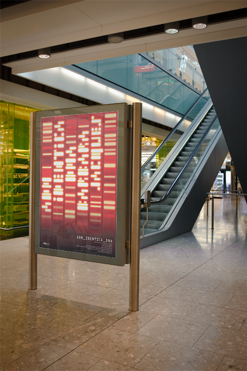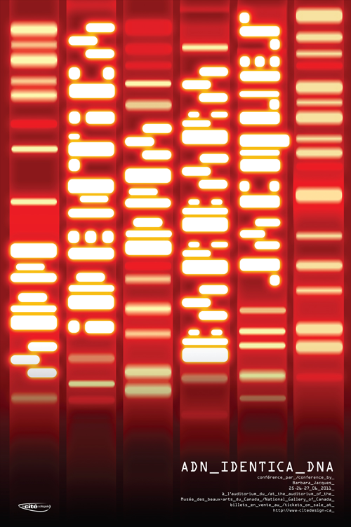 L’objectif derrière ce projet était de créer une affiche typographique qui faisait la promotion d’une conférence sur le design animée par un/une designer d’une entreprise reconnue au niveau local ou international. Dany a choisi la compagnie montréalaise Identica (Cossette Communications) et sa directrice à la création Barbara Jacques. Pour faire le lien avec Identica, une séquence d’ADN a été choisie pour représenter l’identité, puis les lettres de ADN IDENTICA DNA BARBARA JACQUES ont été introduites à la verticale parmi les barres horizontales afin de créer une typographie expérimentale.