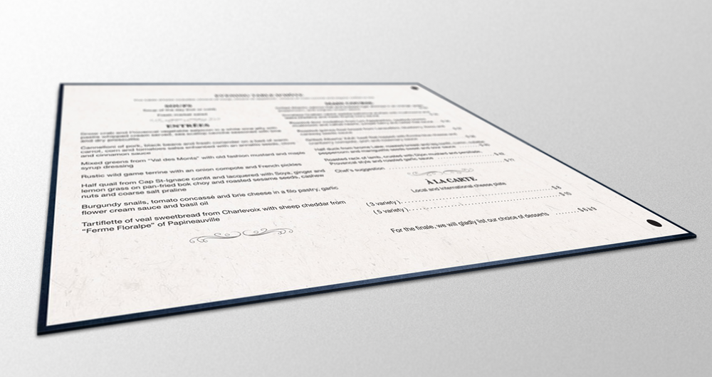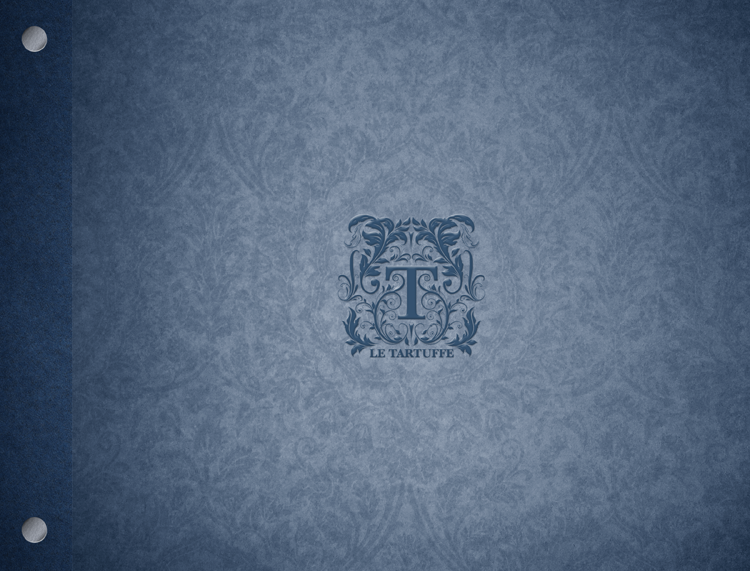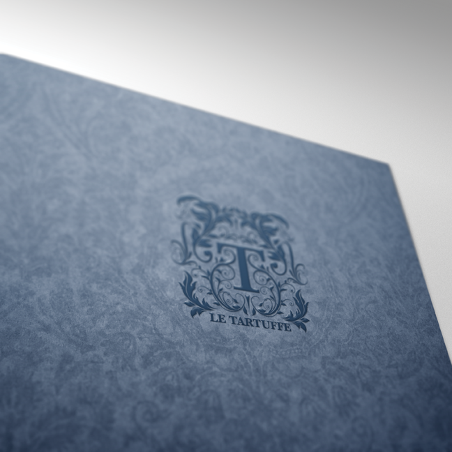 Dans le cadre de ce projet, l’objectif était de concevoir le menu du soir du restaurant de fine cuisine française Le Tartuffe et de revitaliser son logo. Le nouveau logo est inspiré de l’époque de Louis XIV (rococo), celle-là même où la pièce de Molière «Tartuffe» a été écrite et jouée pour la première fois. Beaucoup d’éléments décoratifs et floraux rappelant les rocailles ornent la nouvelle signature typographique du restaurant. Le bleu royal accompagné de ses motifs augmente l’allure classique de la couverture et est approprié pour un menu de soirée.